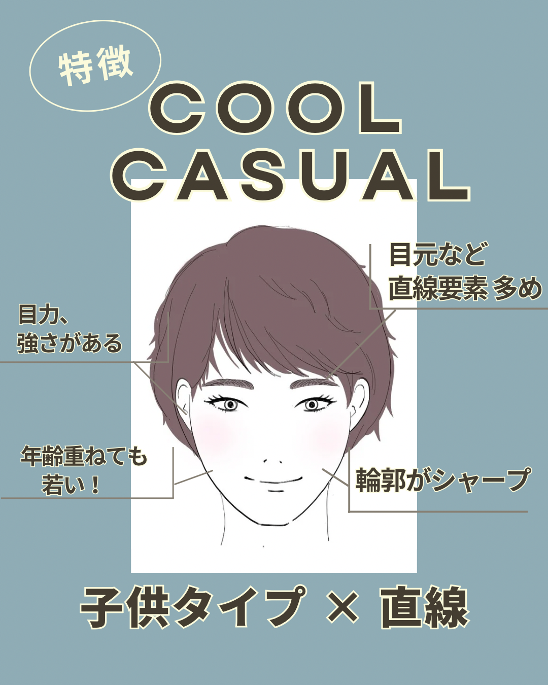 顔のパーツや輪郭に「直線」が多く、実年齢より若く見られやすいのが特徴です。