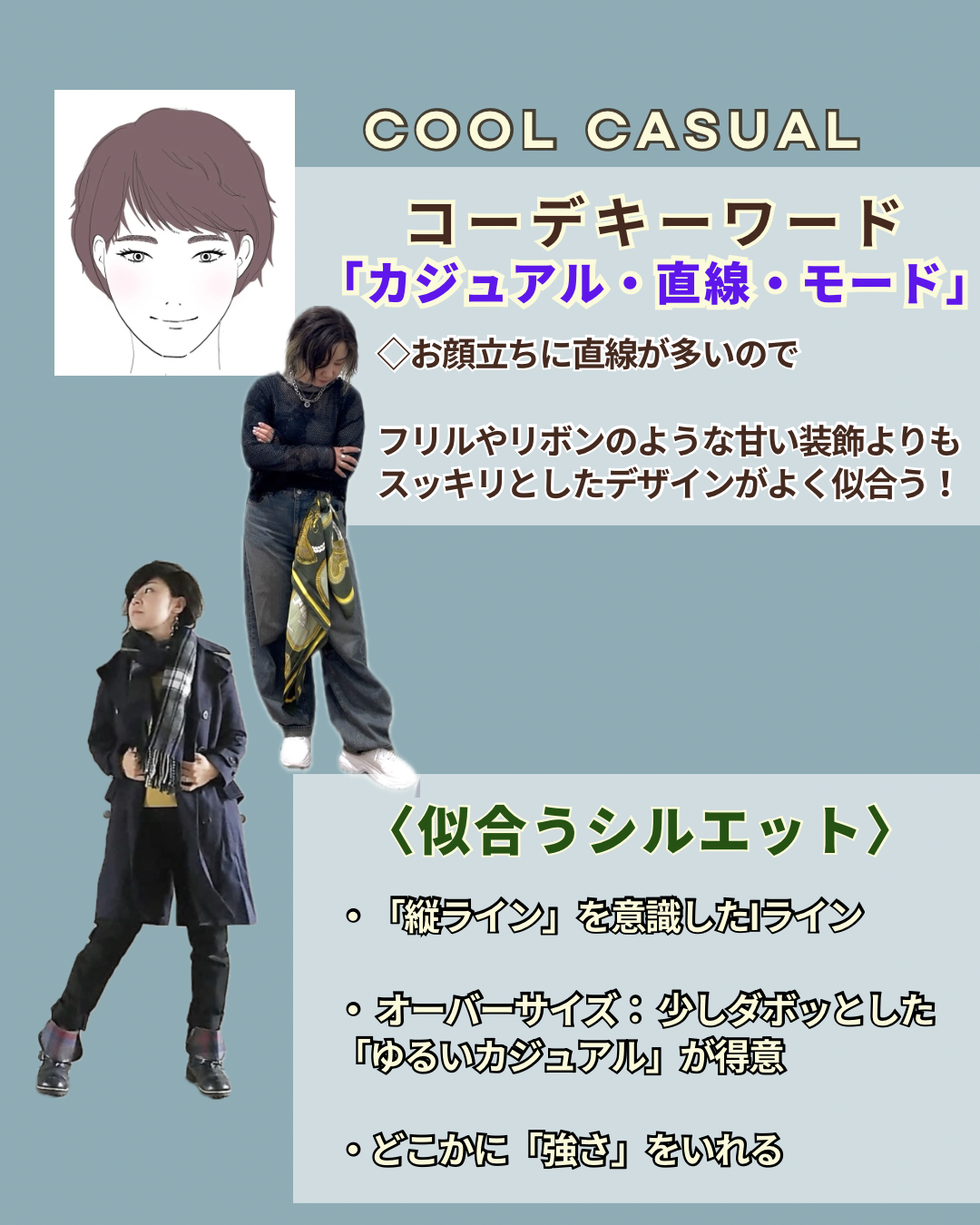 ・ 印象: クール、ボーイッシュ、アーティスティック、おしゃれ